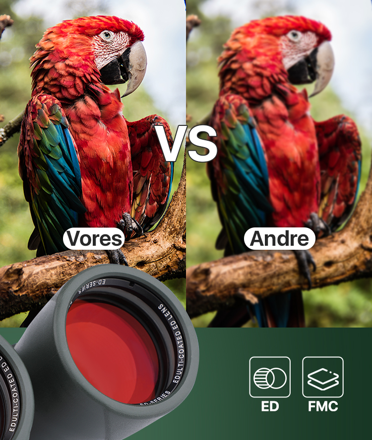 ED-glas (Extra-Low Dispersion) sikrer en mere præcis lysstyring, reducerer kromatisk aberration og visuelle forstyrrelser markant – farver genskabes i deres naturlige tilstand, og detaljer træder tydeligt frem.